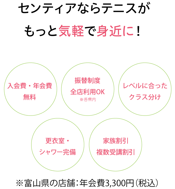 *動きやすいウェア(テニスボールが入るポケット付)、ラケット(無料レンタル有)、室内シューズ(無料レンタル有)、タオル、着替えなどをご持参ください。